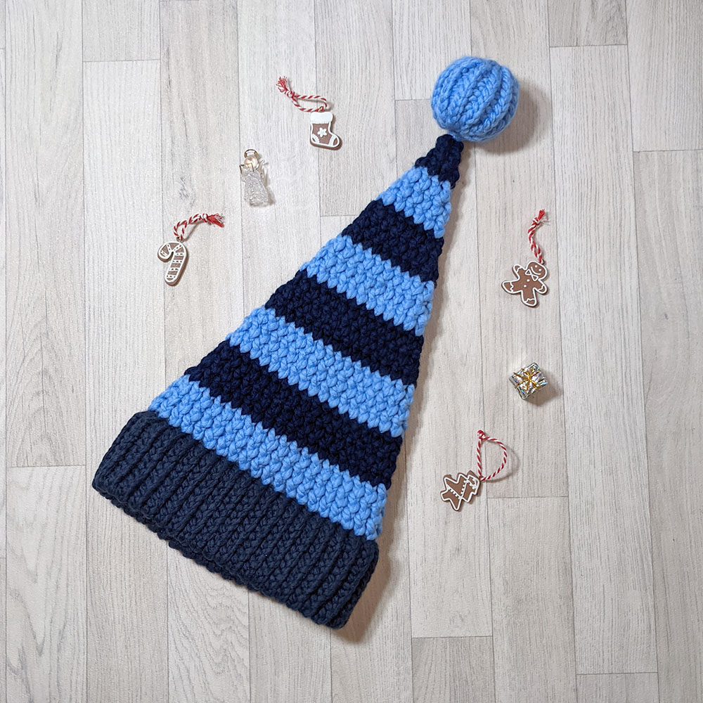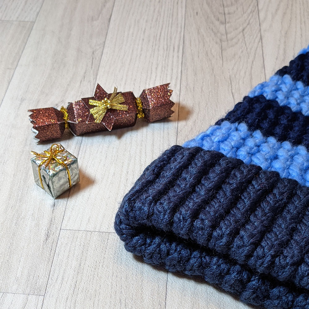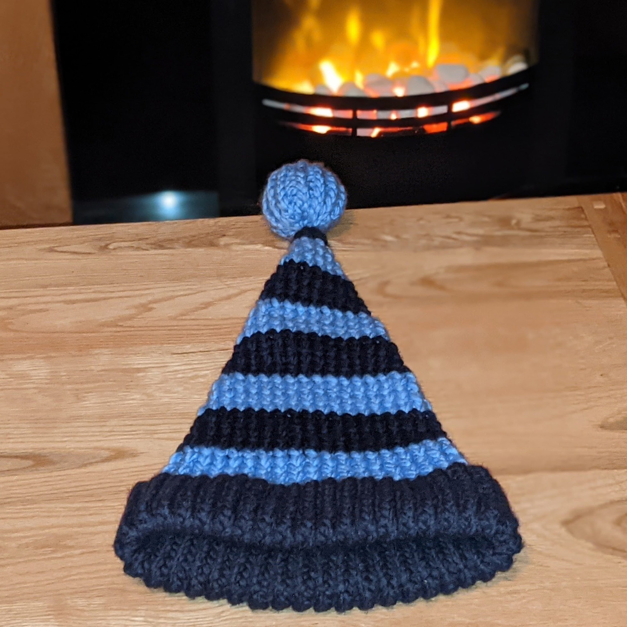 My own version of a knitted Santa hat. The hat is very cosy. Knitted using super chunky 100% acrylic yarn.