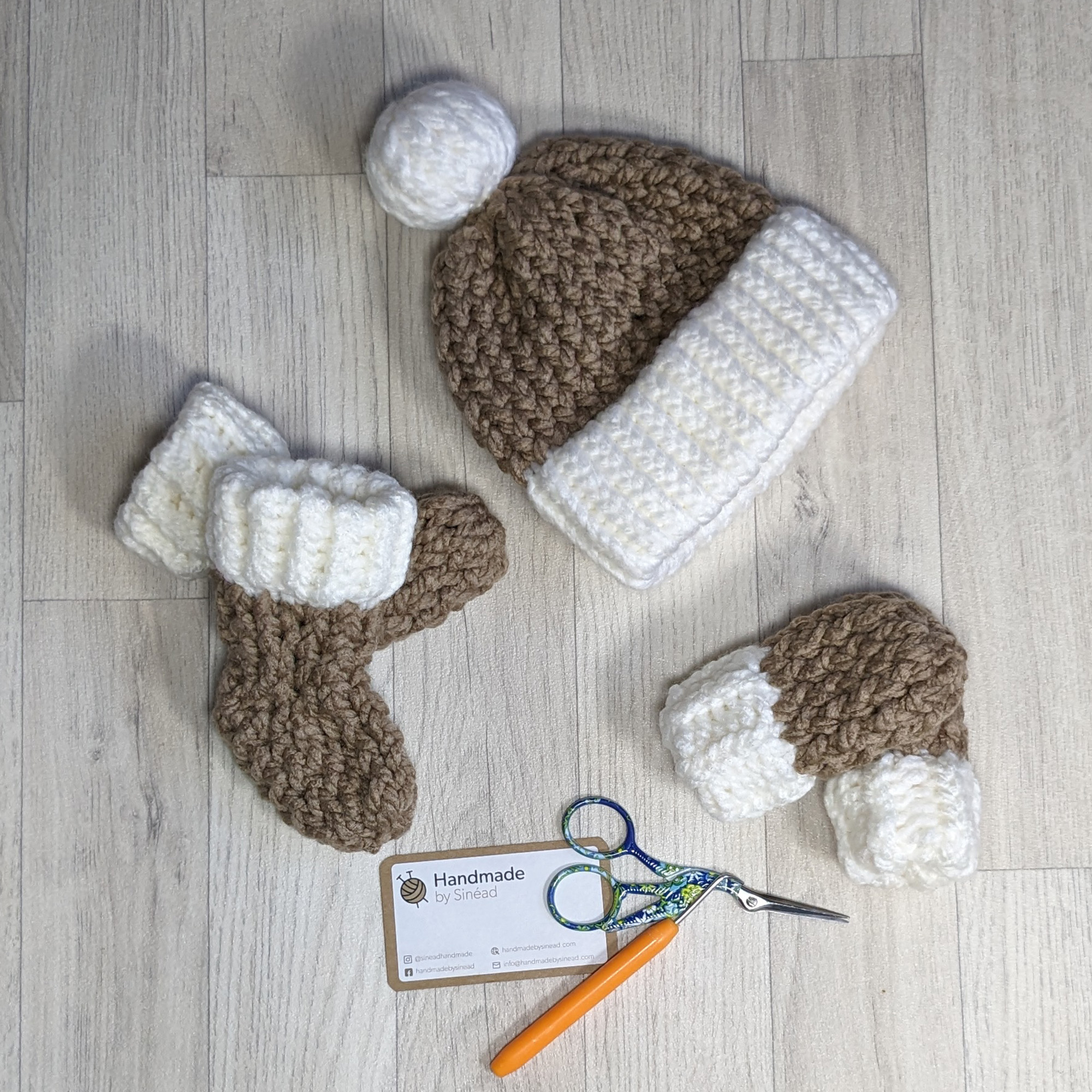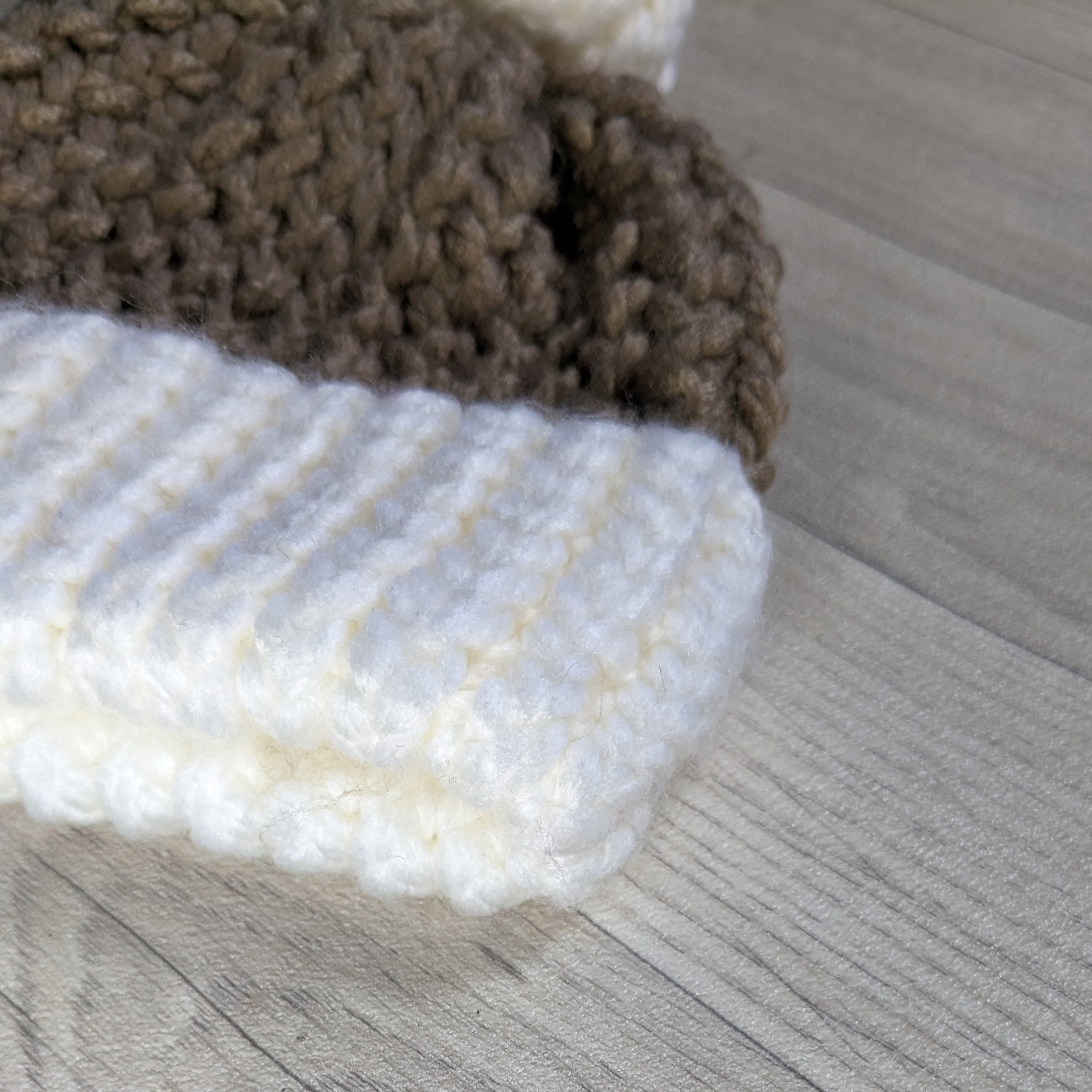 Hand knitted super chunky Neutral Cream and Brown Baby Beanie hat set. Knitted using super chunky yarn with a wide brim and a matching knitted pom-pom.