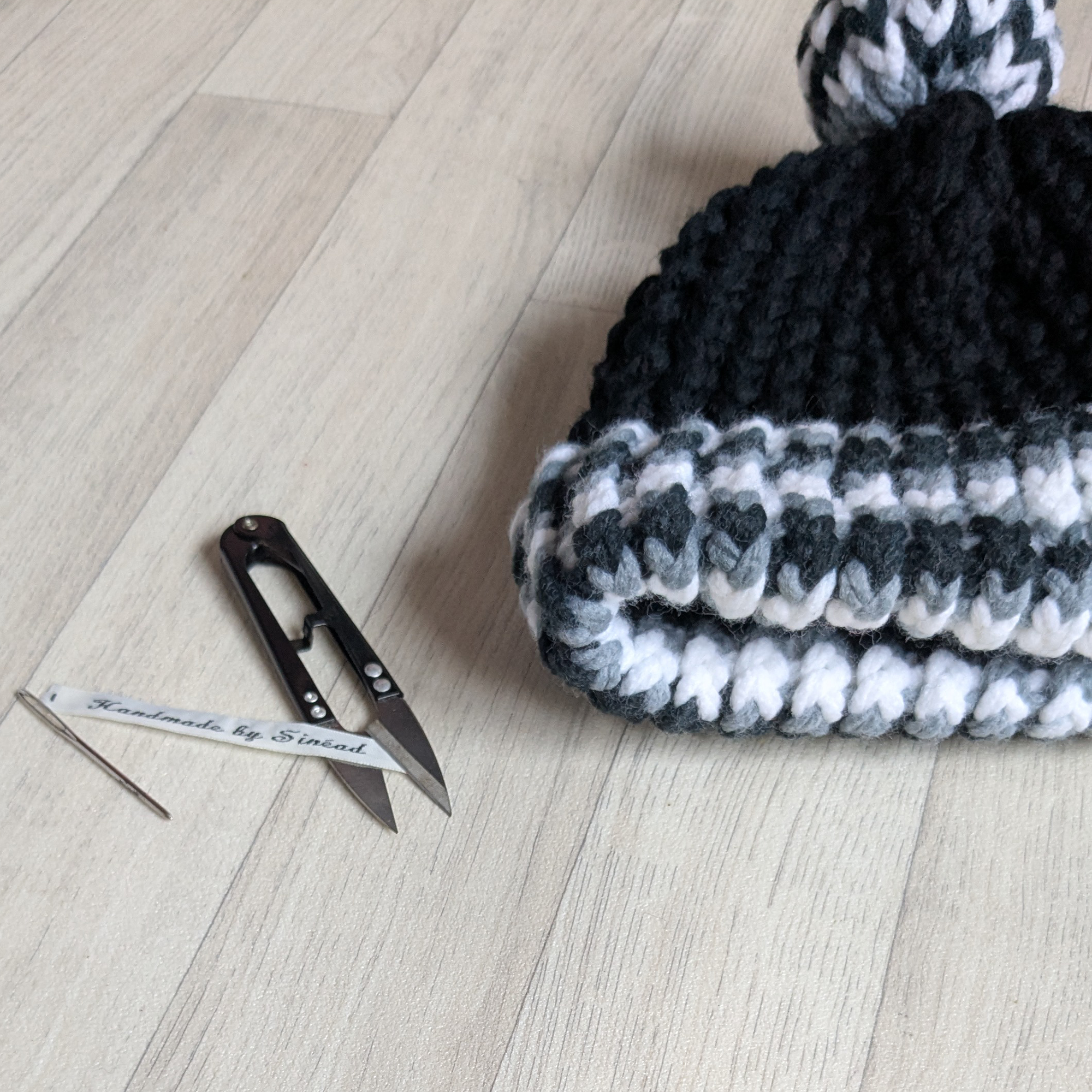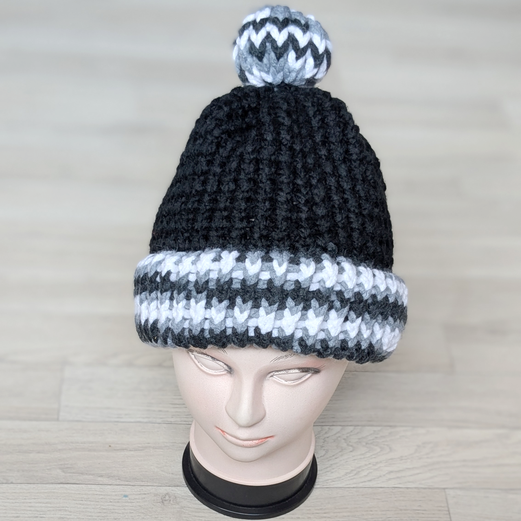 Hand knitted super chunky Barcode, Black, White and Grey Beanie hat. Knitted using super chunky yarn with a wide brim and matching knitted pom-pom.