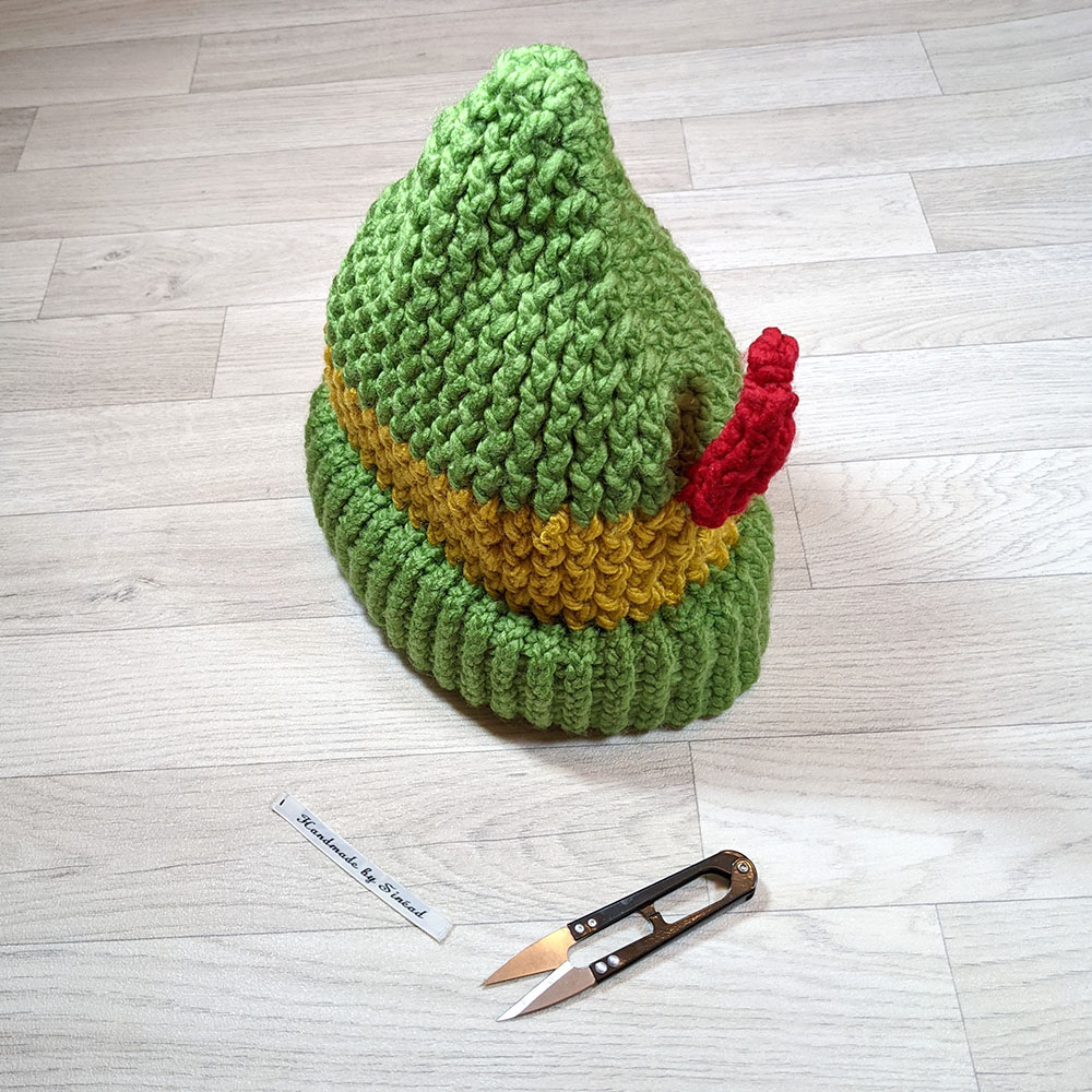Hand knitted super chunky Buddy Green and Gold hat. Knitted using super chunky yarn with a wide brim and and Red knitted feather.