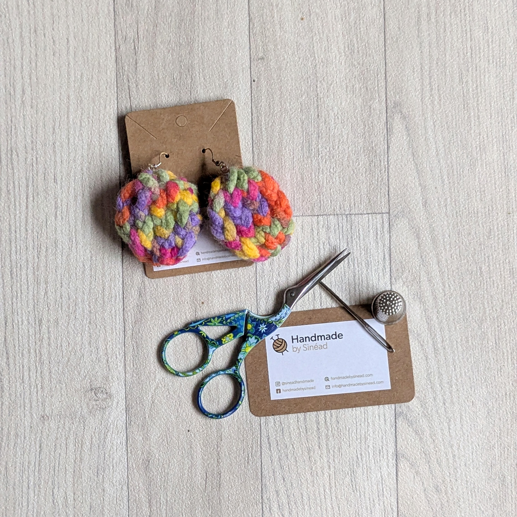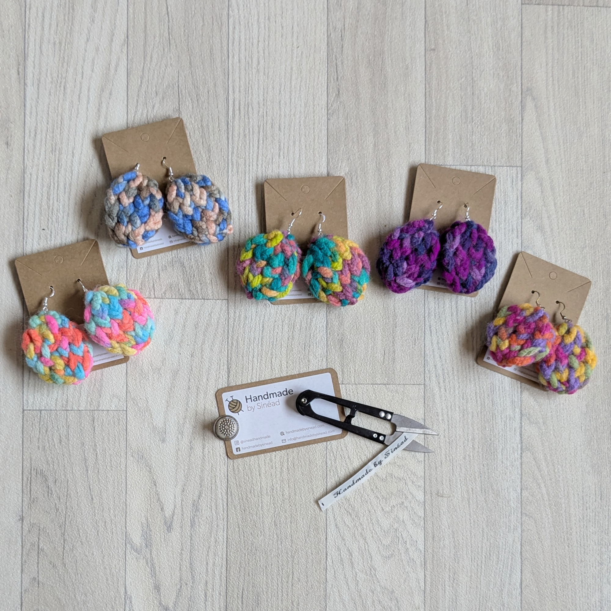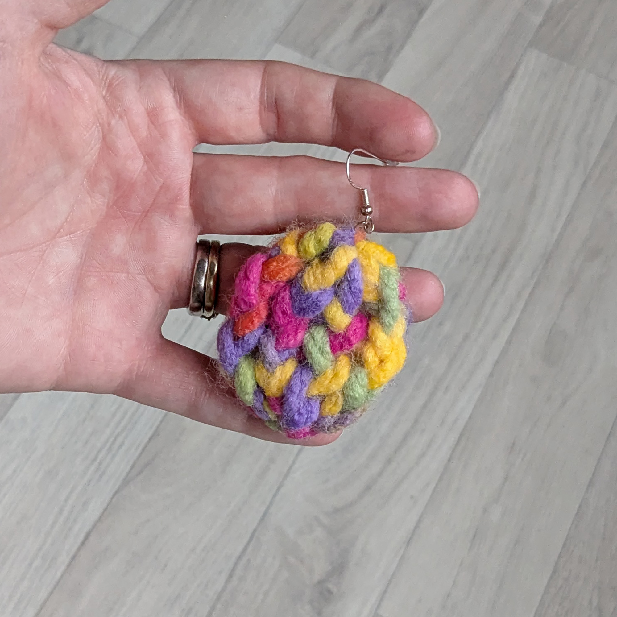 My own version of earrings easter egg, knitted using super chunky 100% acrylic yarn. Knitted around a wooden disk.