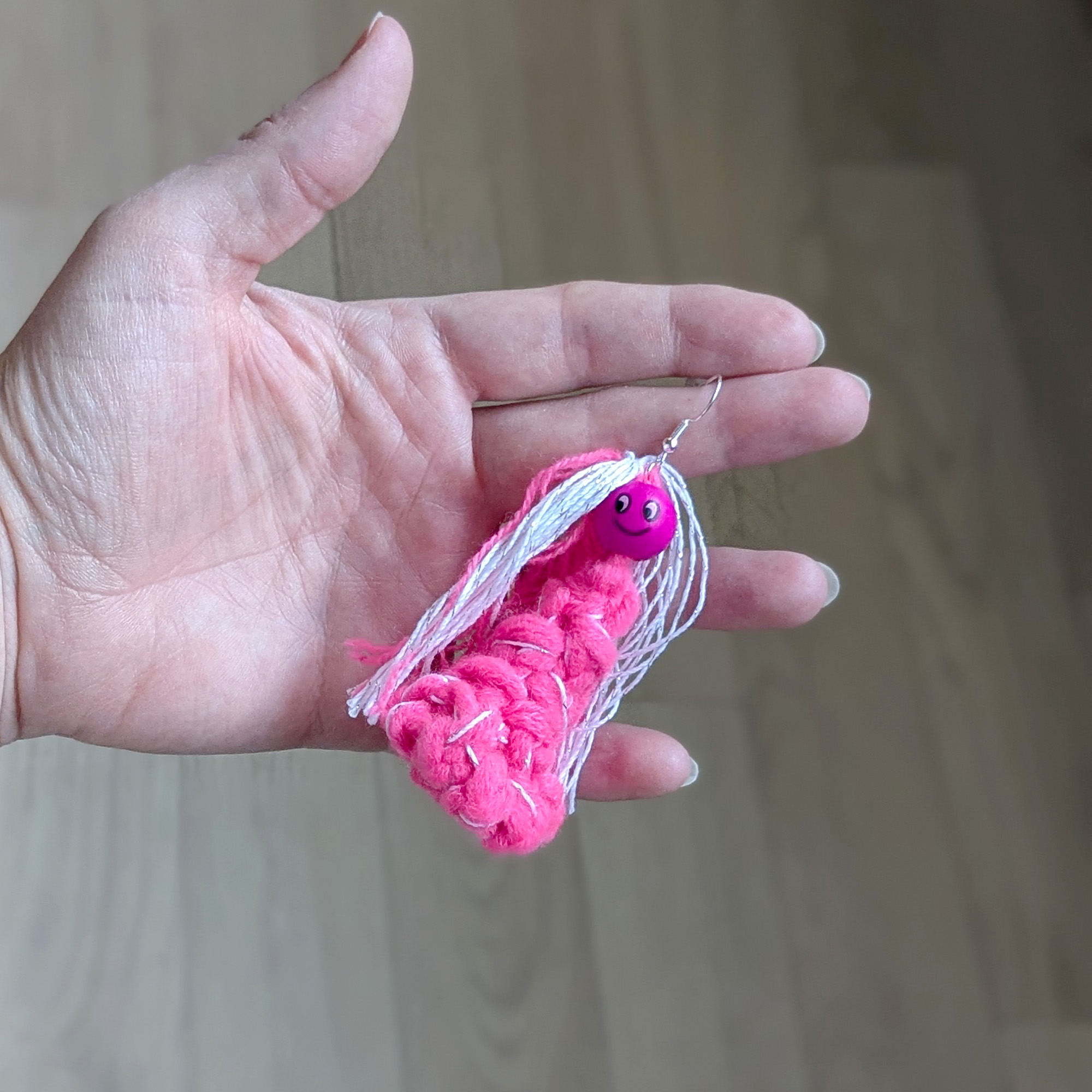 My own version of earrings pixie colour faces, knitted using super chunky 100% acrylic yarn. Pixie head is a wooden bead and hair is glitter string.