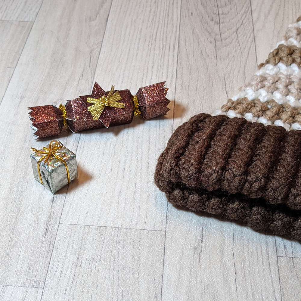 All knitted Santa Hats, Beanie Hats, Costume Hats, Decorations, Gonk Gnomes and Jewellery are my own creations. They are knitted by hand on a circular knitting Loom. If you would like to check out videos of some of my work, Please check out my Tiktok