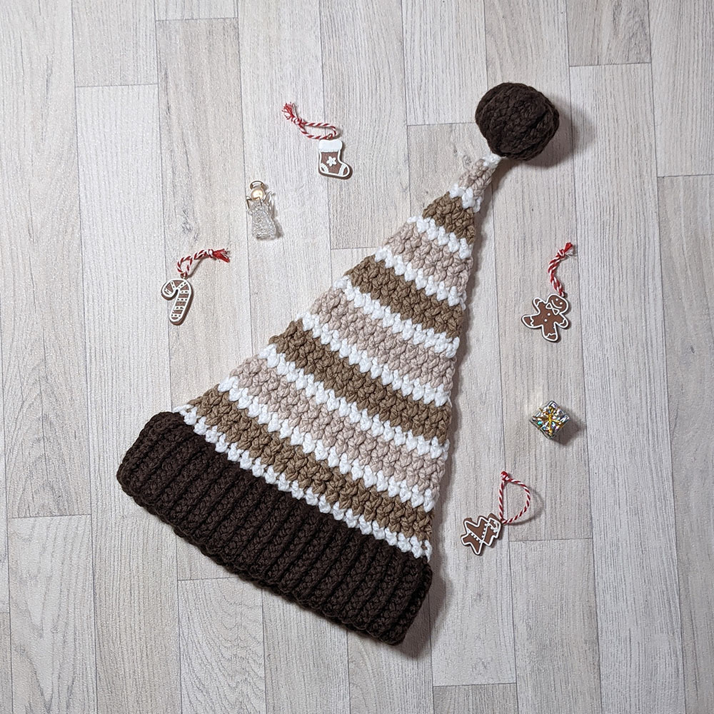 Hand knitted super chunky Latte Brown and White striped Santa style hat. Knitted using super chunky yarn with a wide brim and a matching knitted pom-pom.