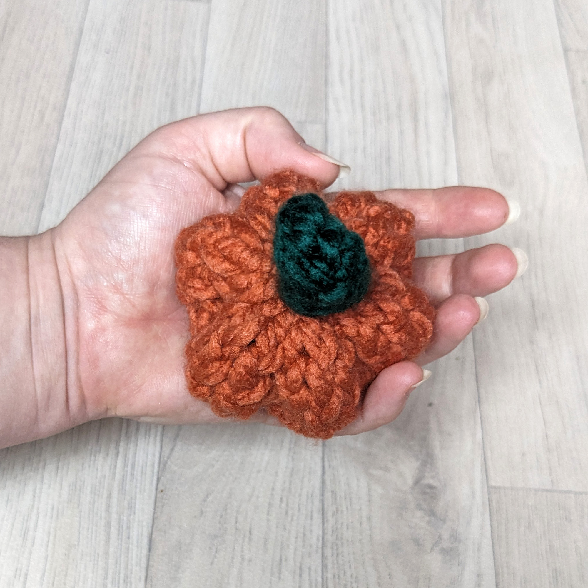 Mini version of pumpkins, knitted as decorations. Knitted using super chunky 100% acrylic yarn.