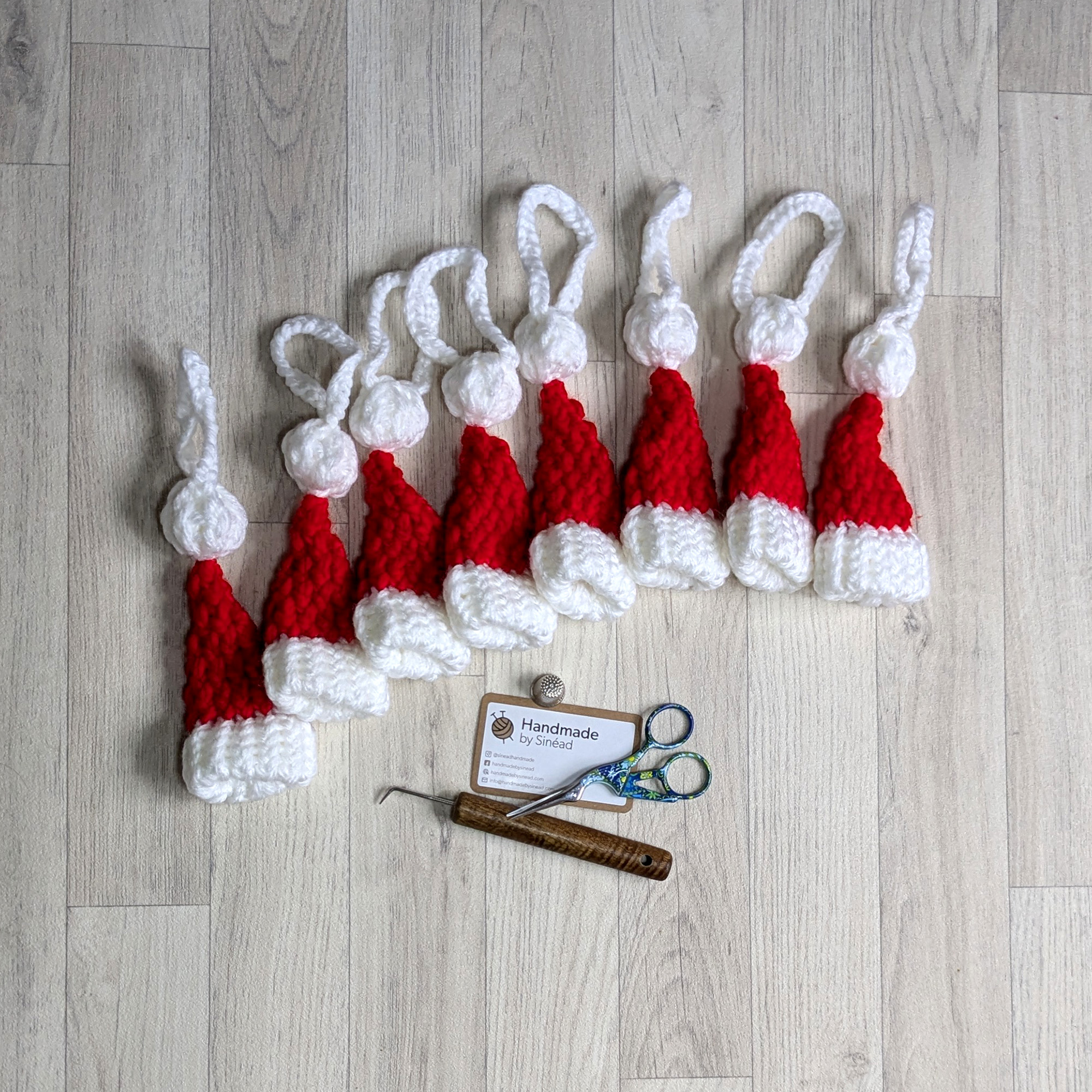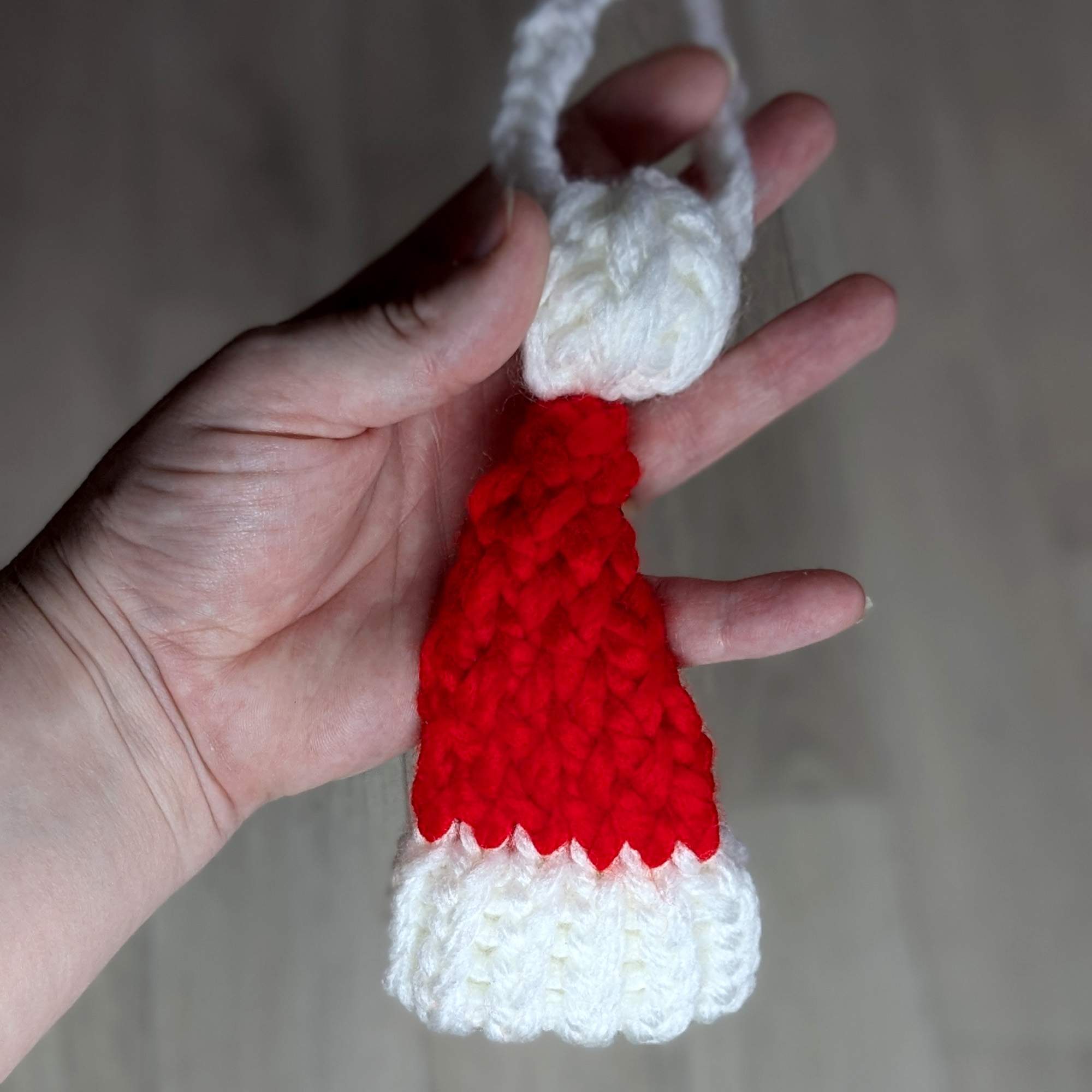 Hand knitted mini Red and White Mini Santa hat Christmas tree decoration. Knitted pom-pom and matching knitted hanging string.