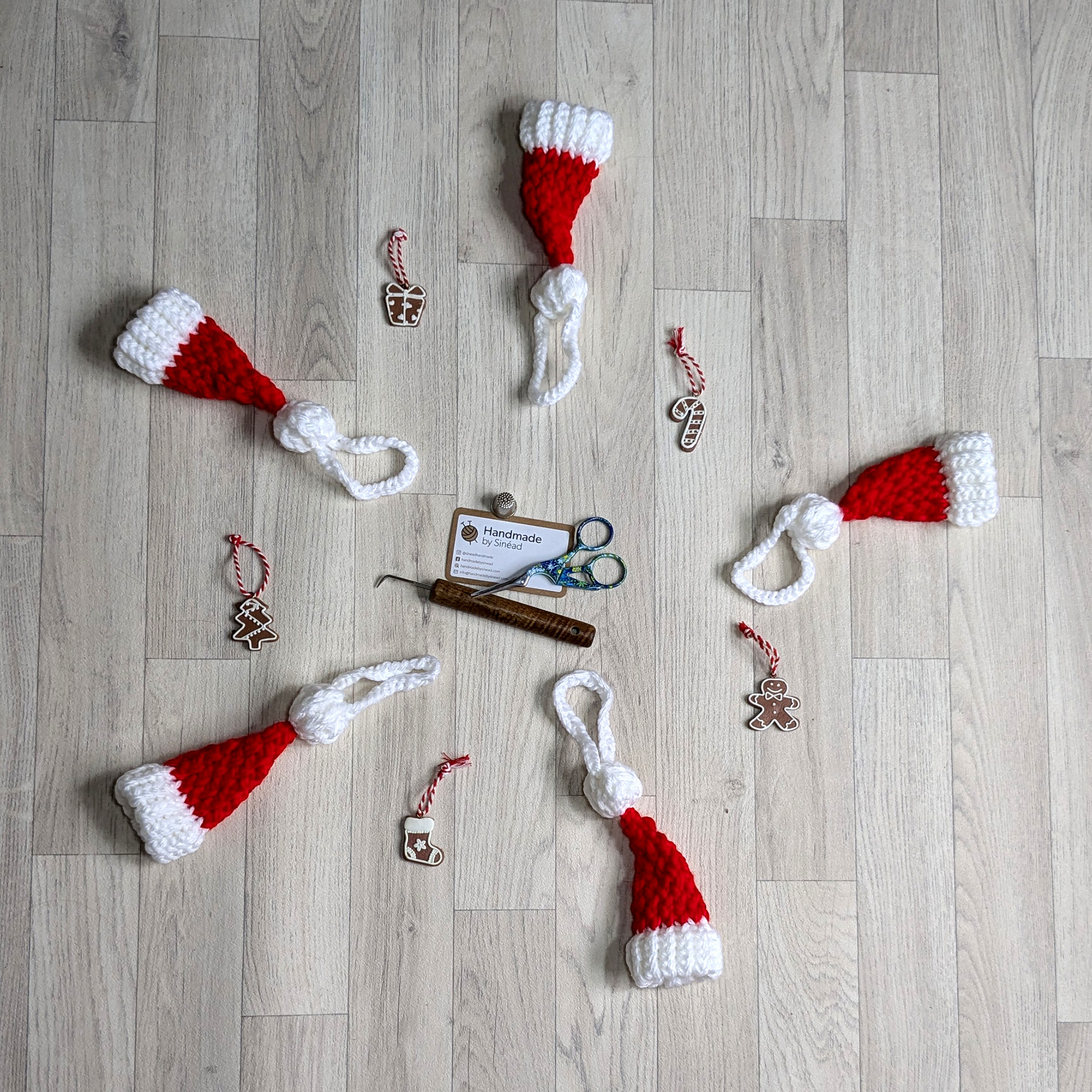 Mini version of my knitted Santa Style hat, knitted as decorations. Knitted in shades of Red and White using super chunky yarn. Knitted using super chunky 100% acrylic yarn.