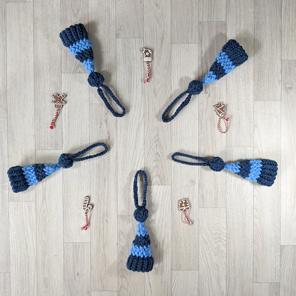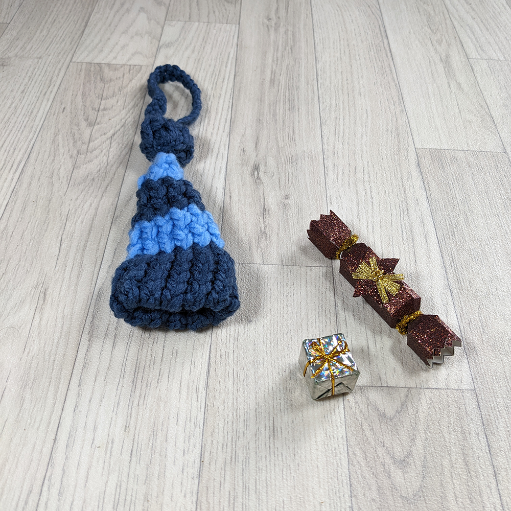 Mini version of my knitted Santa Style hat, knitted as decorations. Knitted in shades of Blue and Navy using super chunky yarn. Knitted using super chunky 100% acrylic yarn.