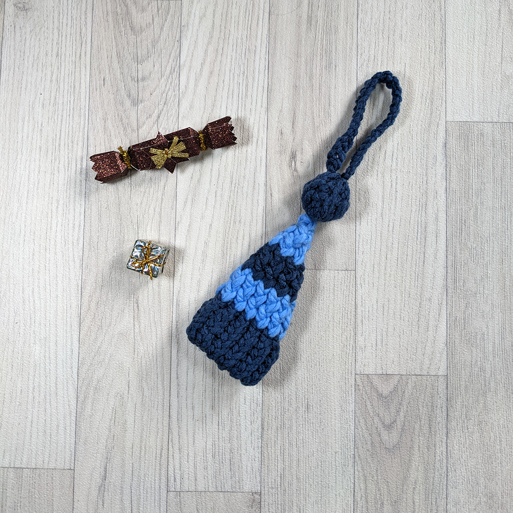 Decoration Stripes – Hand knitted mini Blue and Navy Striped Mini Santa hat Christmas tree decoration. Knitted pom-pom and matching knitted hanging string.