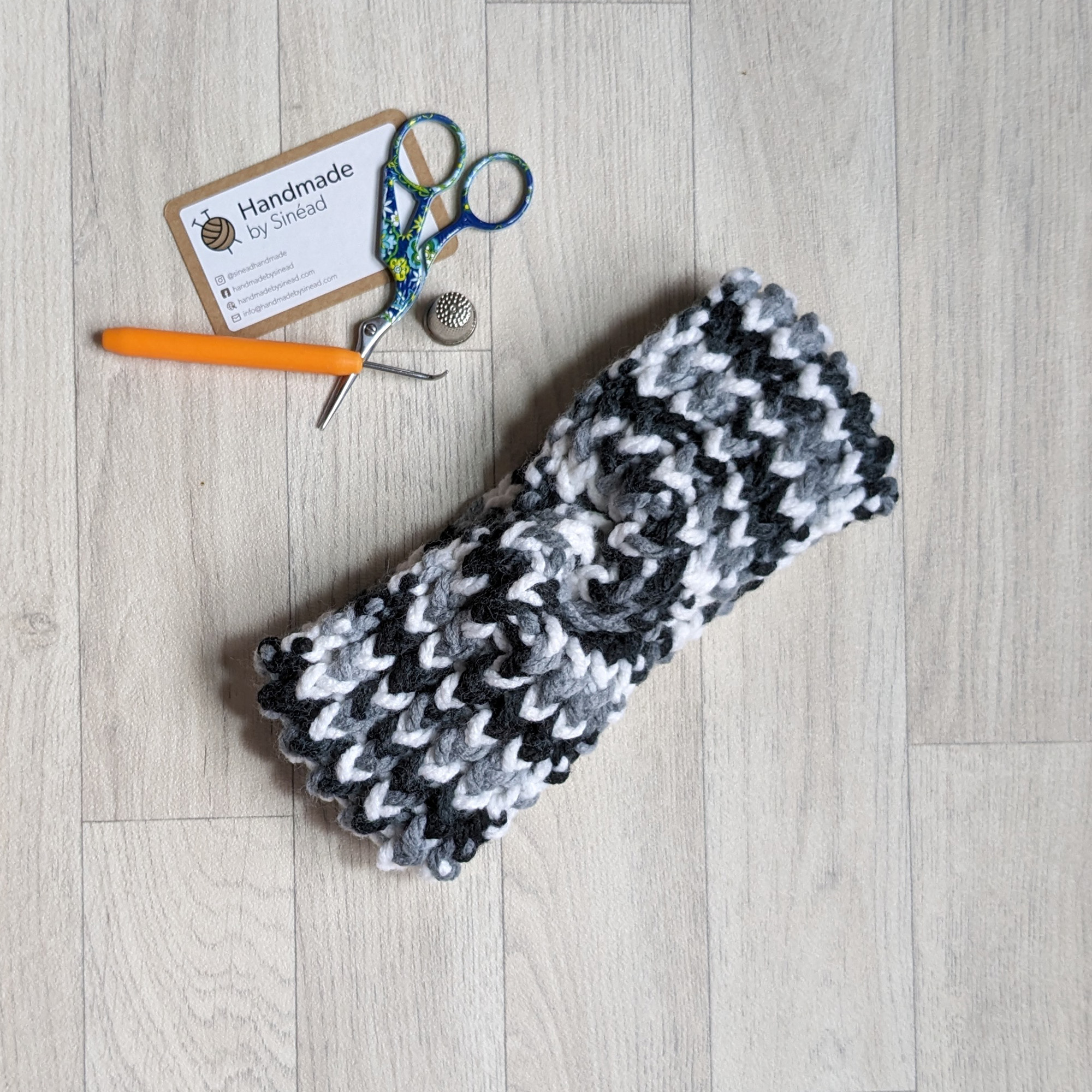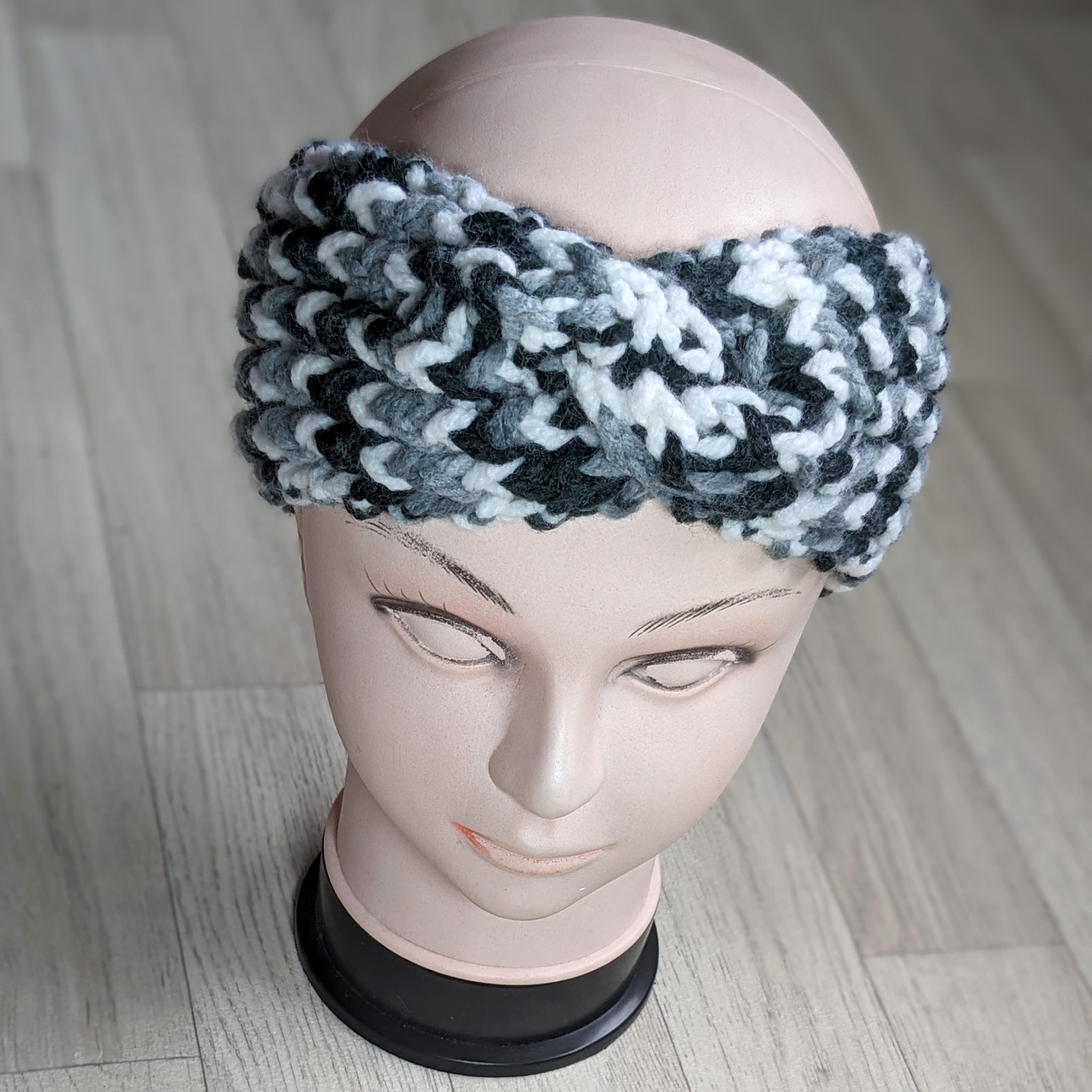 Monochrome Headband – Knitted using super chunky yarn. My own version of a knitted headband knitted using super chunky 100% acrylic yarn.