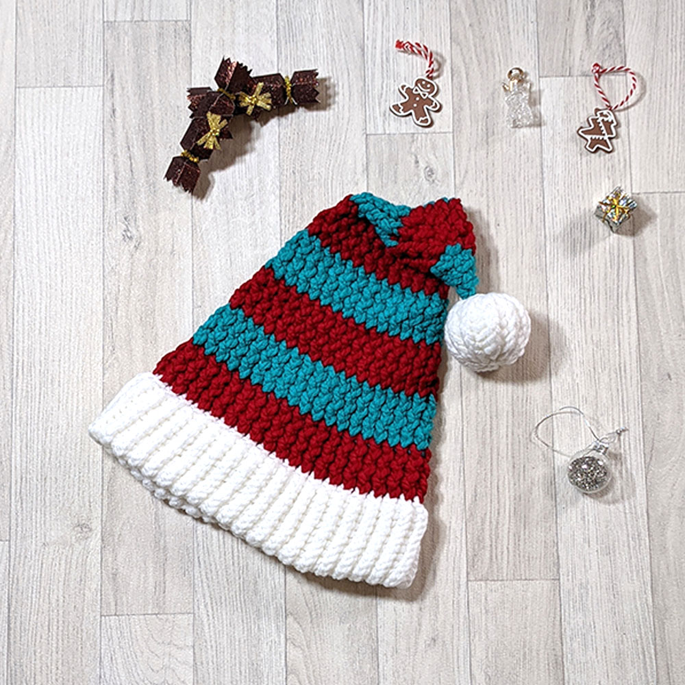 Hand knitted super chunky Rogue Teal and Dark Red striped Santa style hat. Knitted using super chunky yarn with a wide brim and a matching knitted pom-pom.
