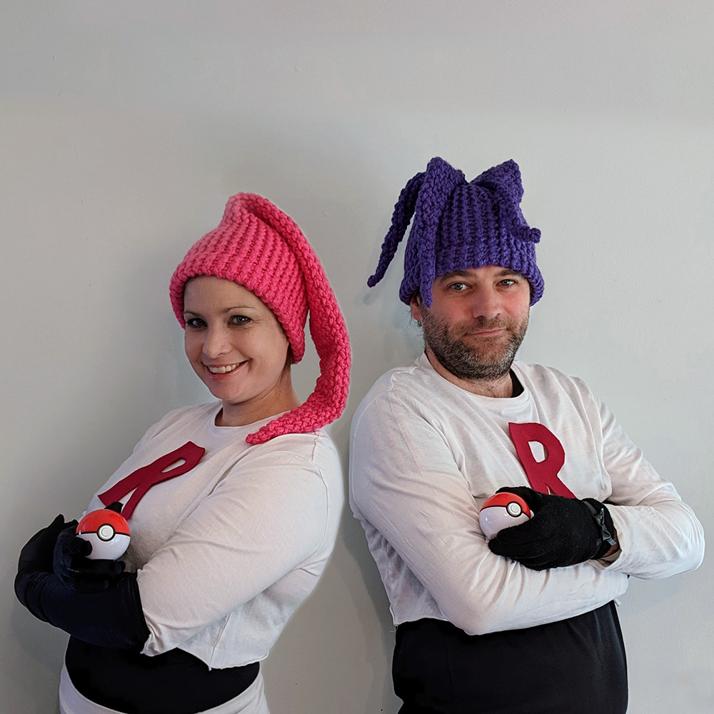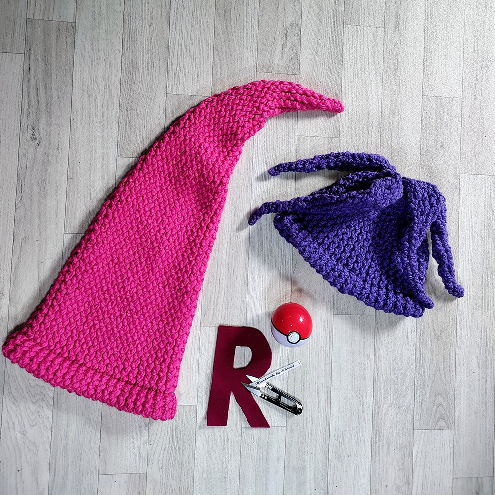 My own version of a knitted costume hat/hair. Inspired by Pokemon Team Rocket. The hats are very soft and cosy. Knitted using super chunky 100% acrylic yarn.